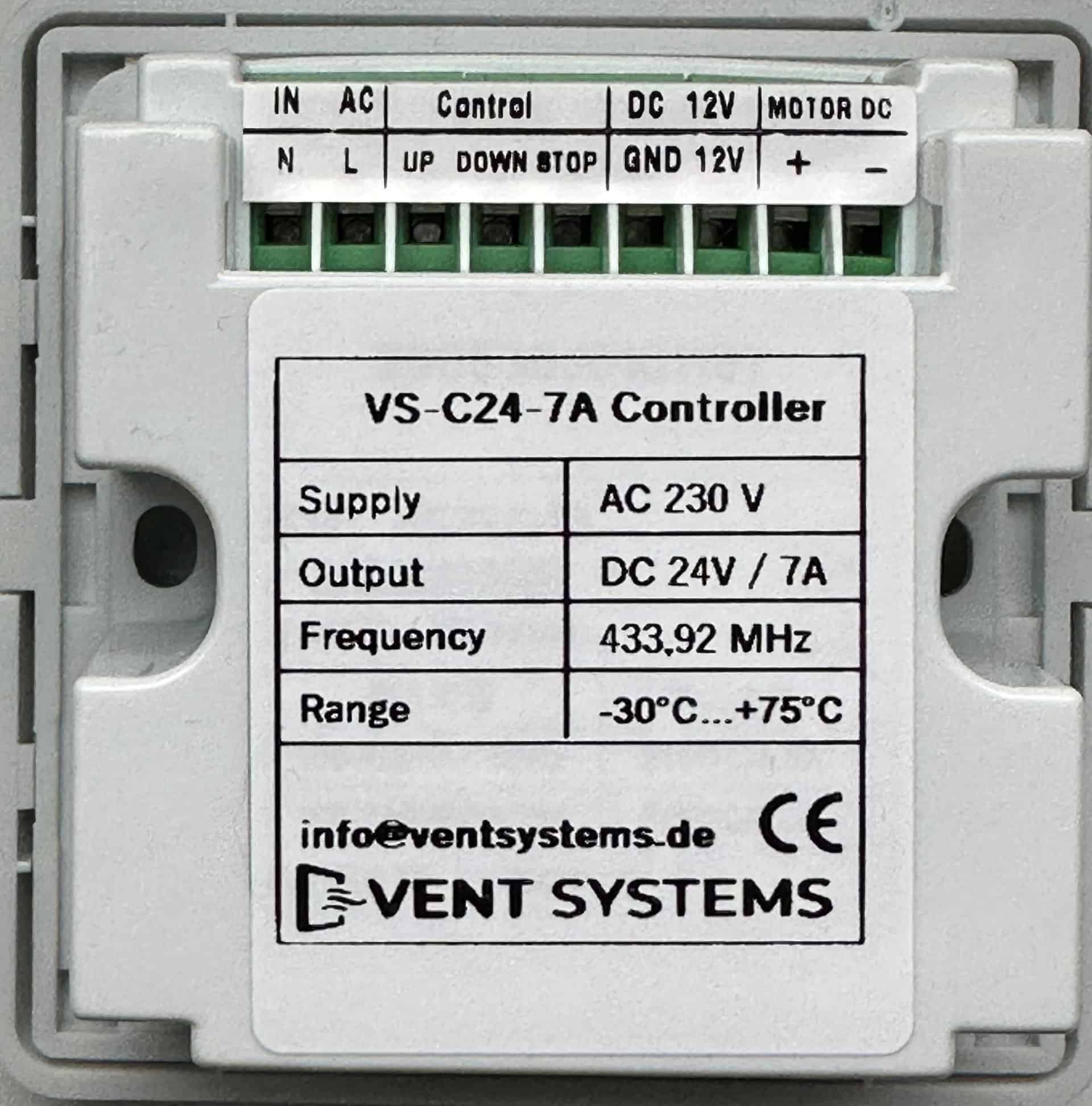 Der Controller VS-C24-7A wandelt 230 V Wechselstrom in 24 V Gleichstrom um und versorgt elektrische Fensterantriebe, Jalousien, Rollläden, Garagentoröffner usw. mit Strom. Zubehör wie Wind- oder Regensensoren kann ebenfalls angeschlossen werden. Der angeschlossene Antrieb öffnet und schließt durch Umkehrung der Polarität am Eingang. Die Steuerung erfolgt über eine Taste am Gerät oder eine Funkfernbedienung.